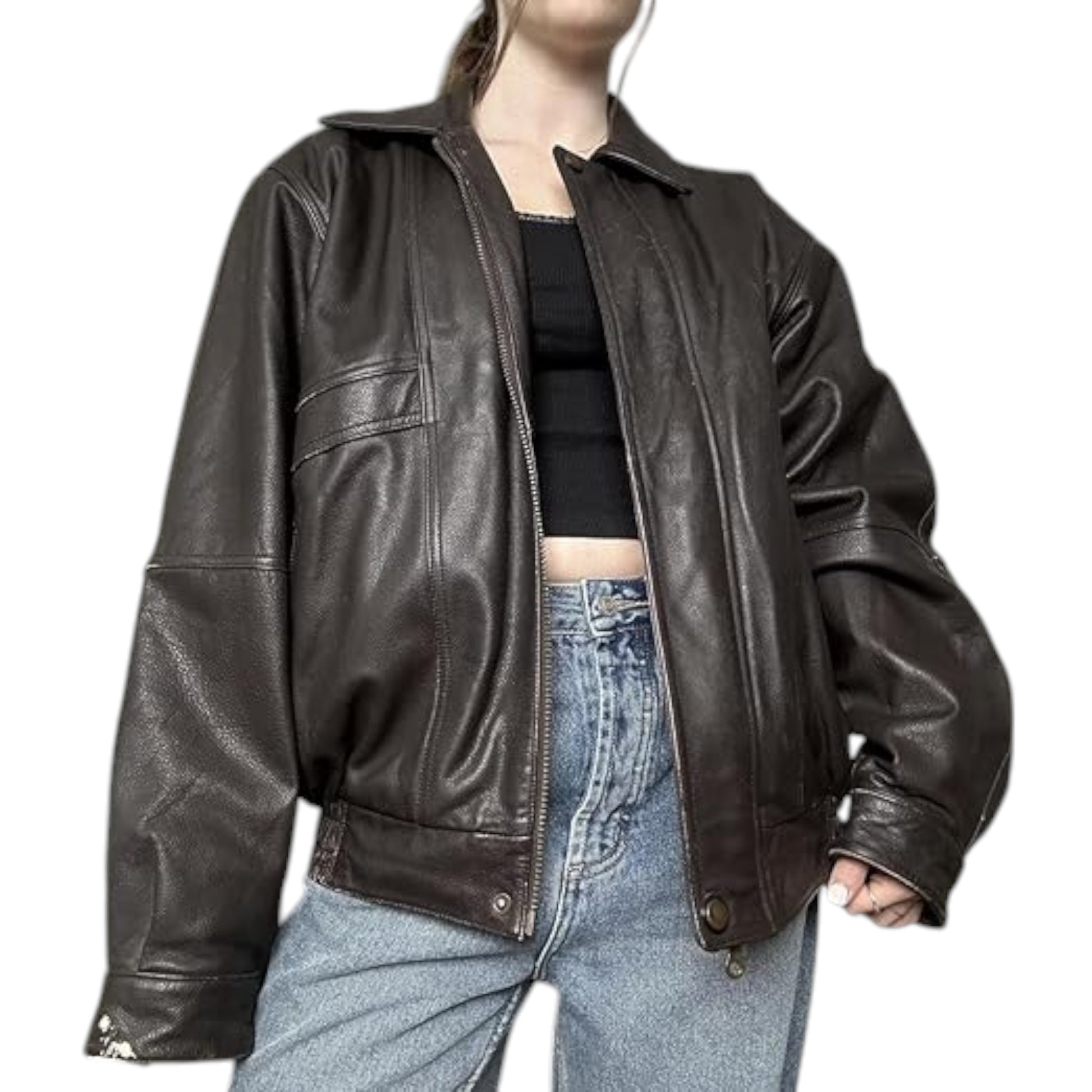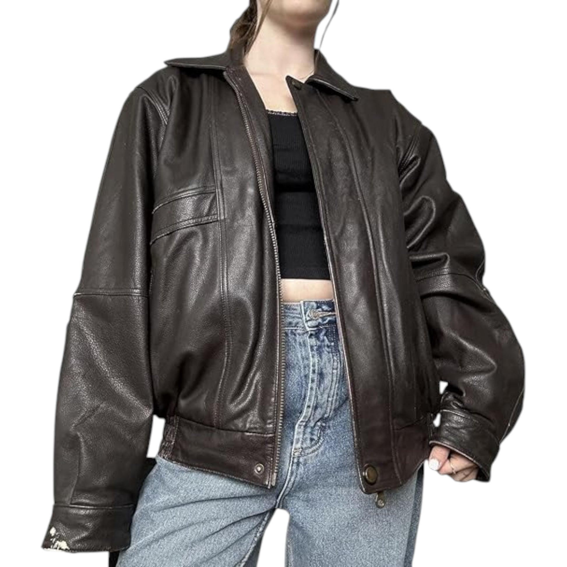 Step back into the iconic 90s with the High-Quality 90s Brown Leather Bomber - Women's . Crafted from premium genuine leather, High-Quality 90s Brown Leather Bomber - Women's jacket combines vintage oversized style with modern comfort. Featuring ribbed cuffs, a full zip front, and a soft inner lining, it’s perfect for casual outings, layering over sweaters, or city adventures.
