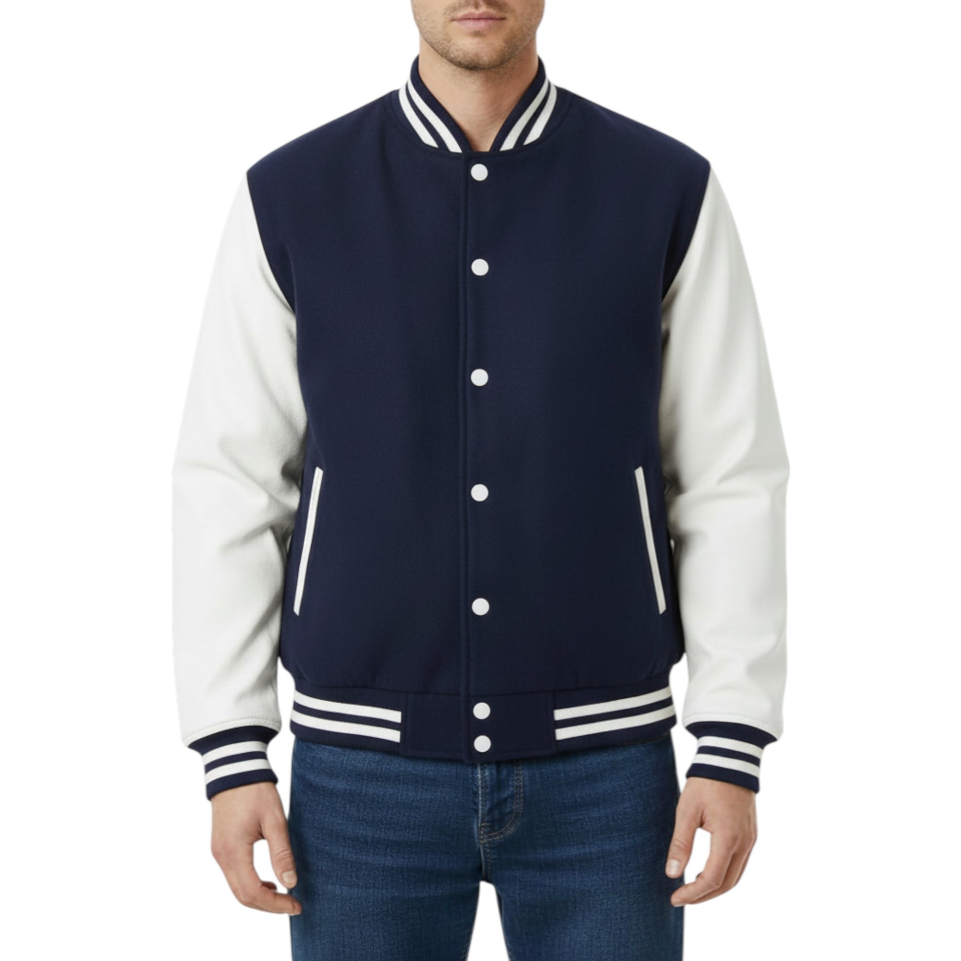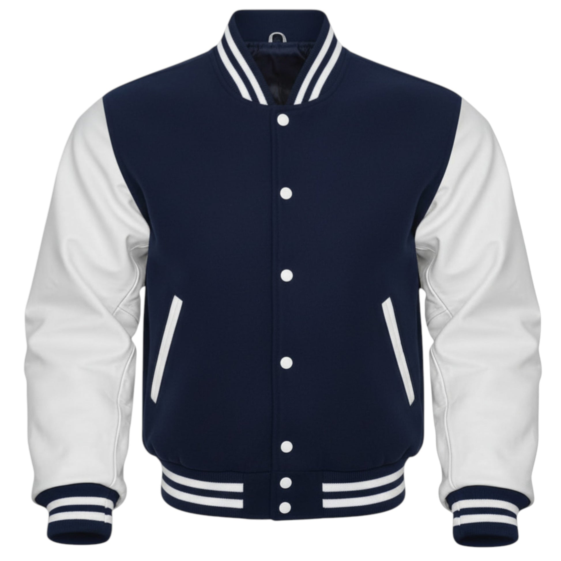 Upgrade your wardrobe with this Navy Blue Varsity Letterman Bomber Jacket. Featuring a deep navy wool-blend body with crisp white sleeves and stylish striped trim, this jacket delivers classic varsity appeal with modern comfort. Perfect for casual wear, campus life, or layering in cooler seasons.