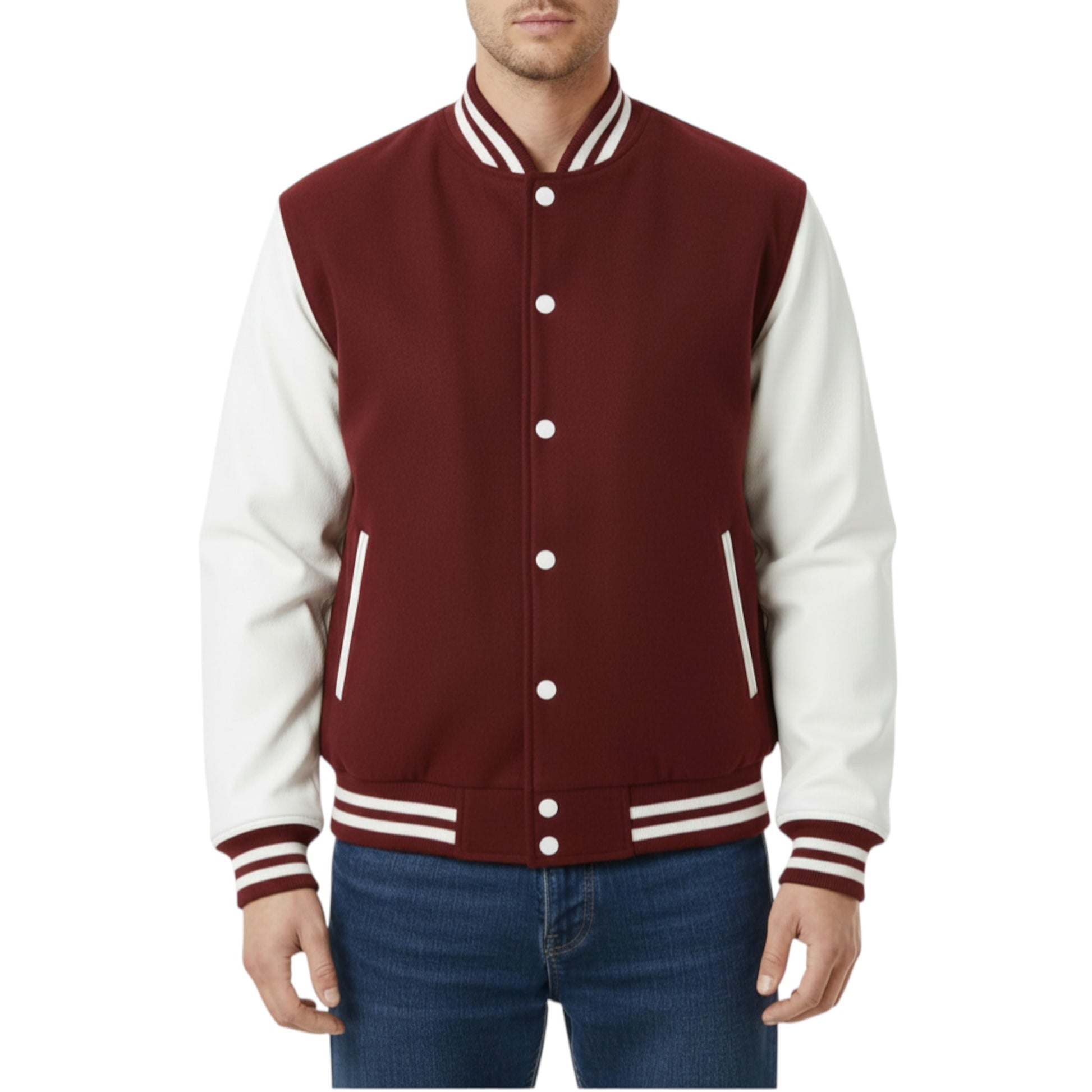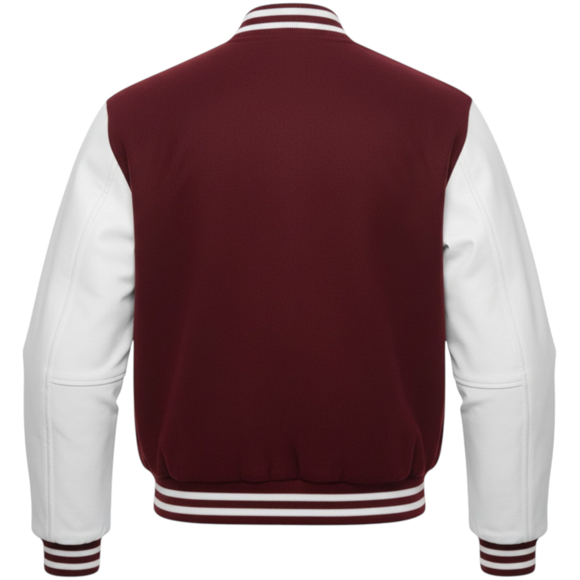 Wine-red body with white sleeves for a striking two-tone varsity look