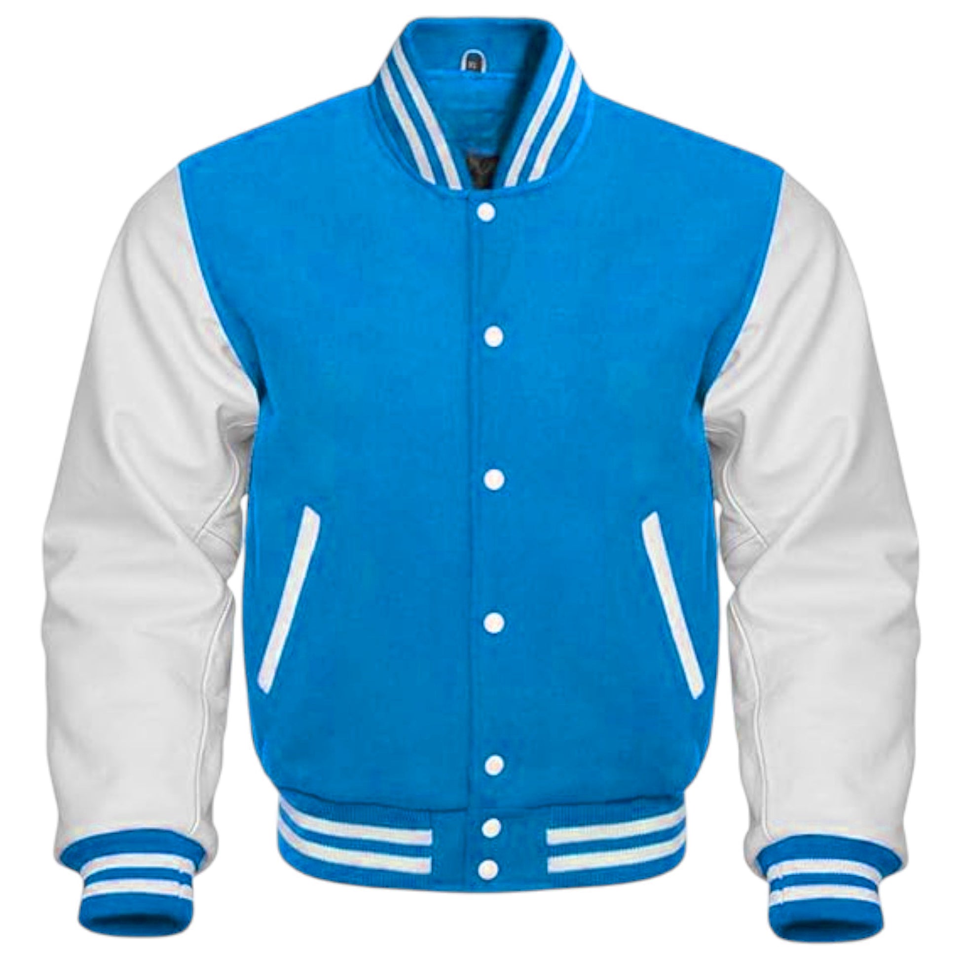 Step up your style with this Sky & White Varsity Letterman Jacket. Made with a wool body and genuine leather sleeves, this classic baseball bomber jacket offers both comfort and durability. Perfect for casual outings, sports events, or layering over your favorite outfits. Ideal for men who love timeless varsity fashion.