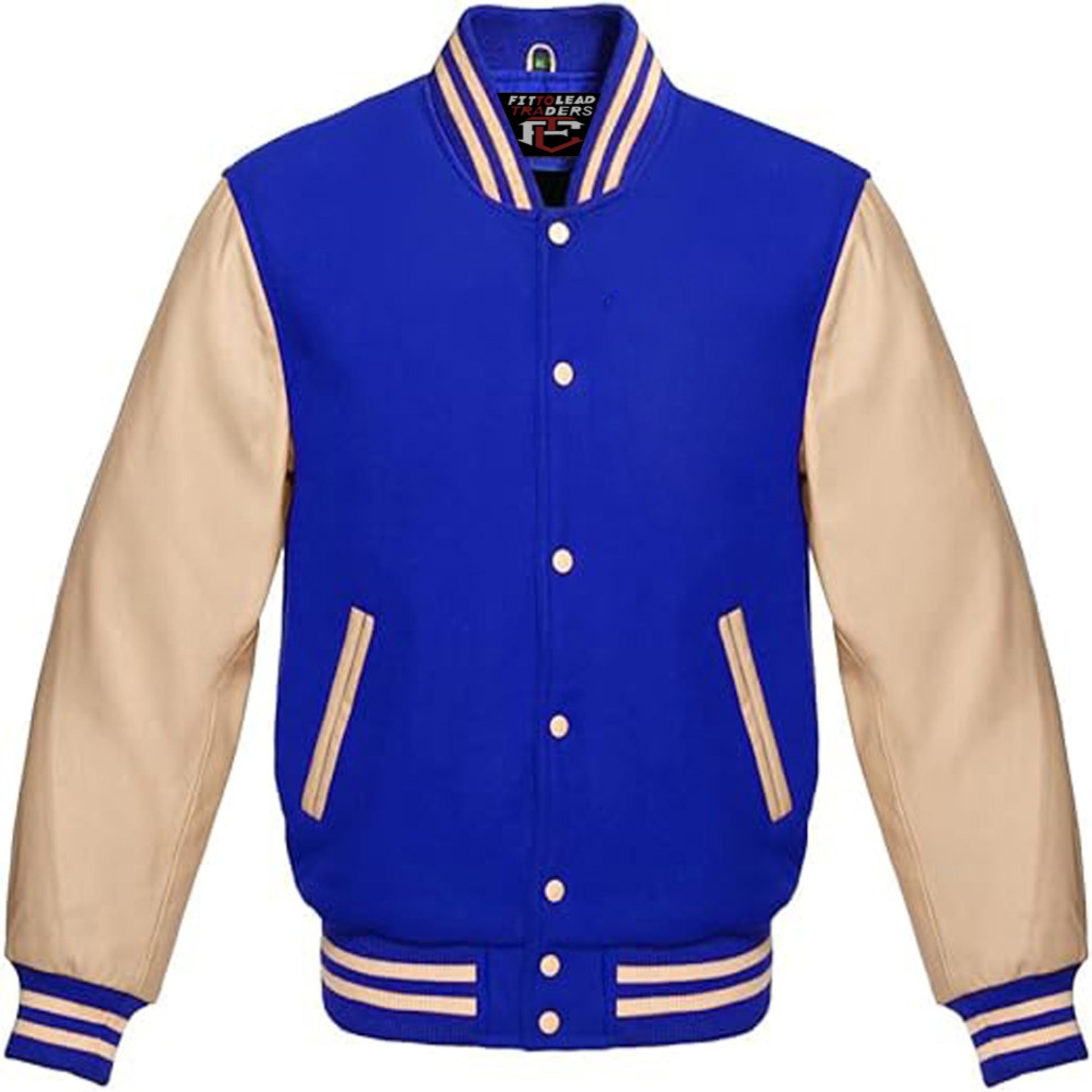 This Classic Wool Varsity Jacket with Cream Leather Sleeves jacket features a wool body and cream leather sleeves in a vintage baseball style. Stay warm and stylish with this timeless piece, perfect for any casual or athletic occasion. Made from high-quality materials to ensure comfort and durability for years to come.