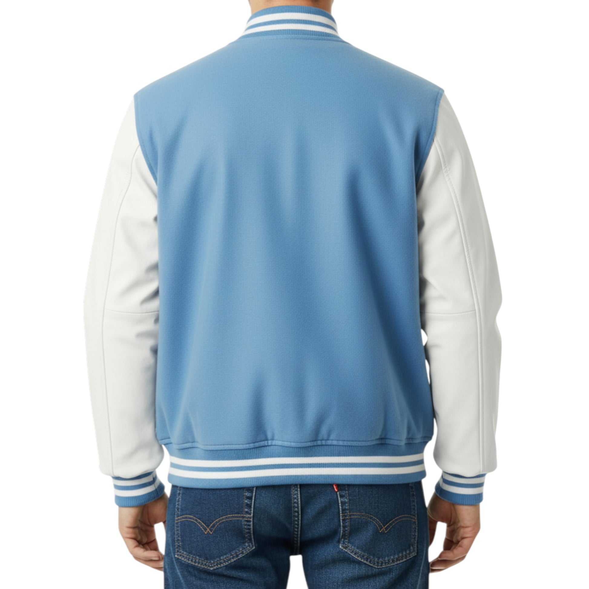 Stand out in style with this Unisex Bright Sky Blue & White Letterman Bomber. Featuring a vibrant sky blue wool-blend body with crisp white sleeves, this retro varsity jacket combines classic letterman aesthetics with modern comfort. Perfect for casual outings, campus life, or layering during cooler seasons.