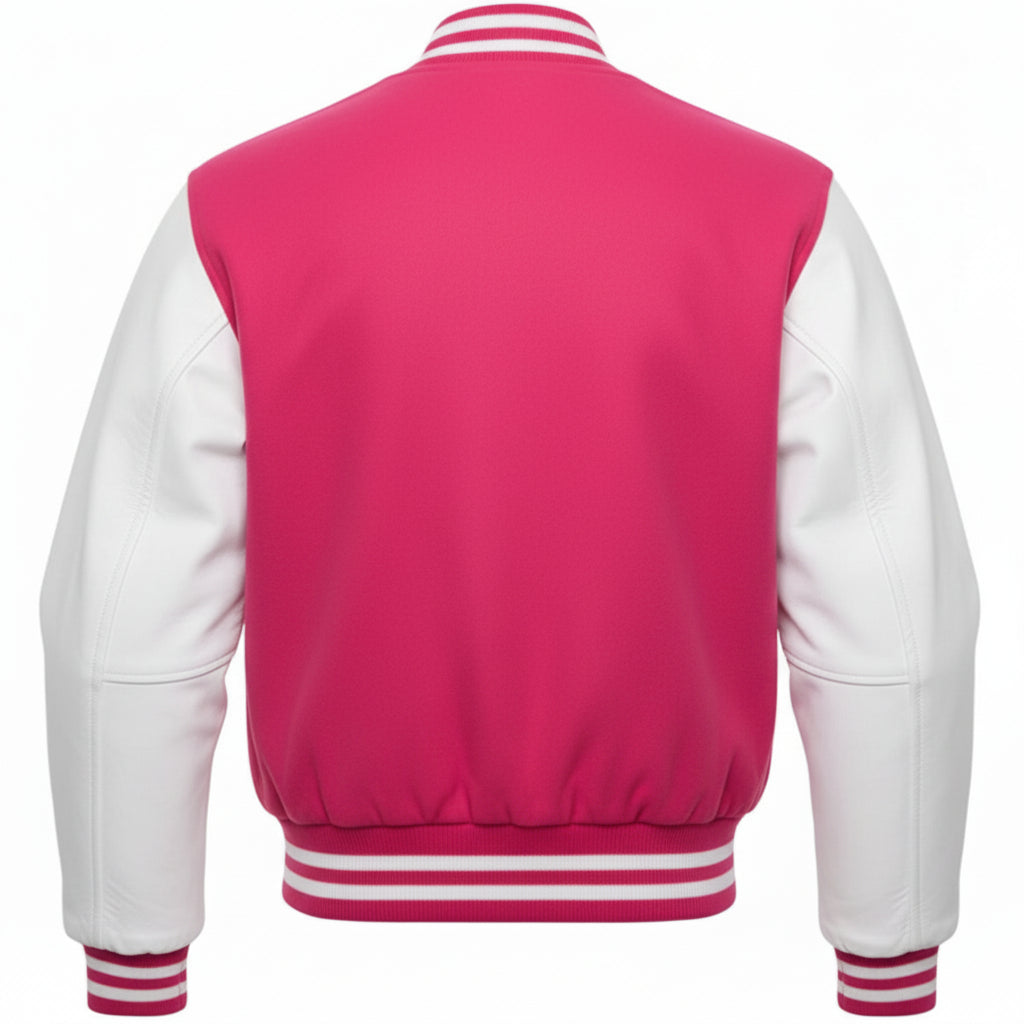 Two-Tone Letterman Design – Classic varsity style with a vibrant pink body