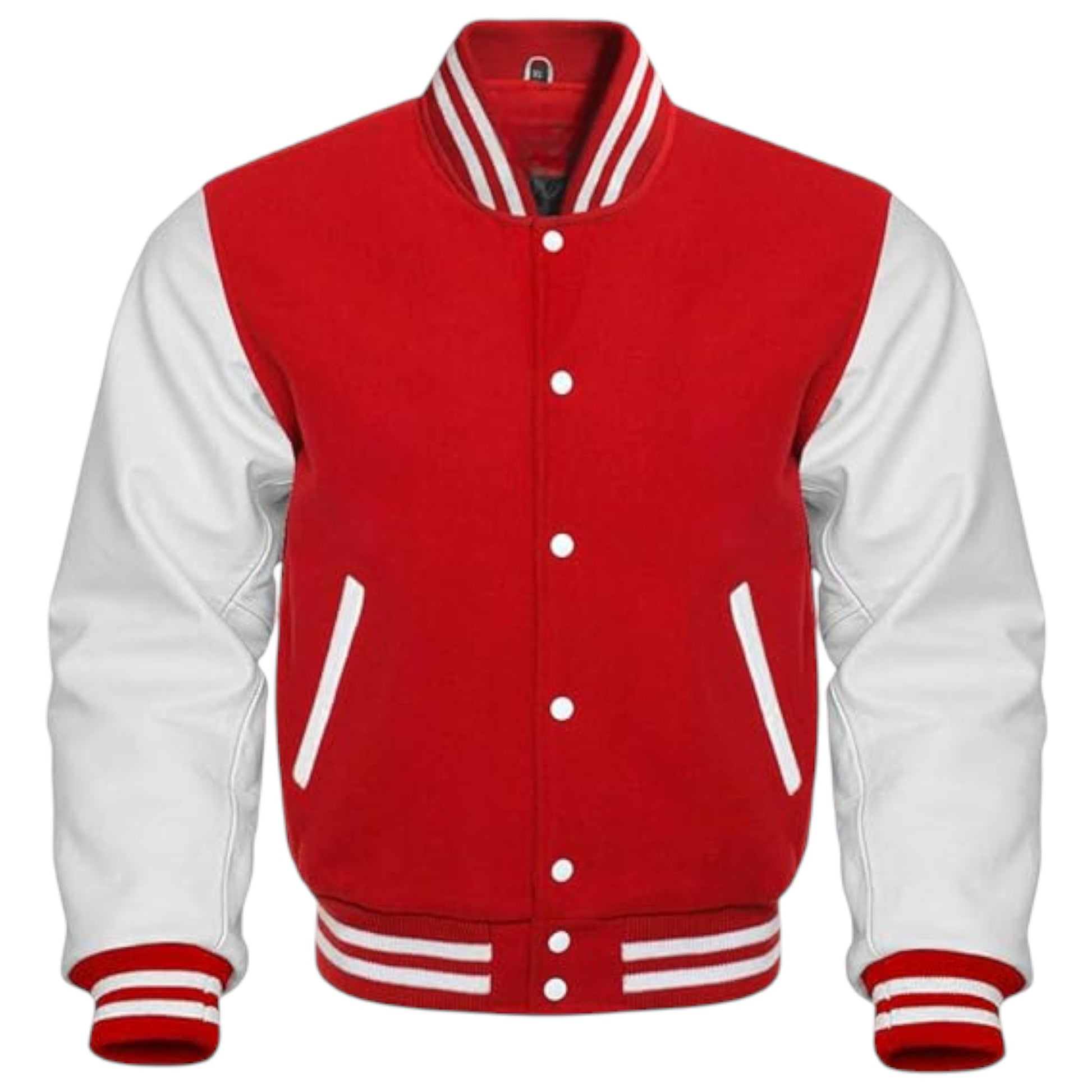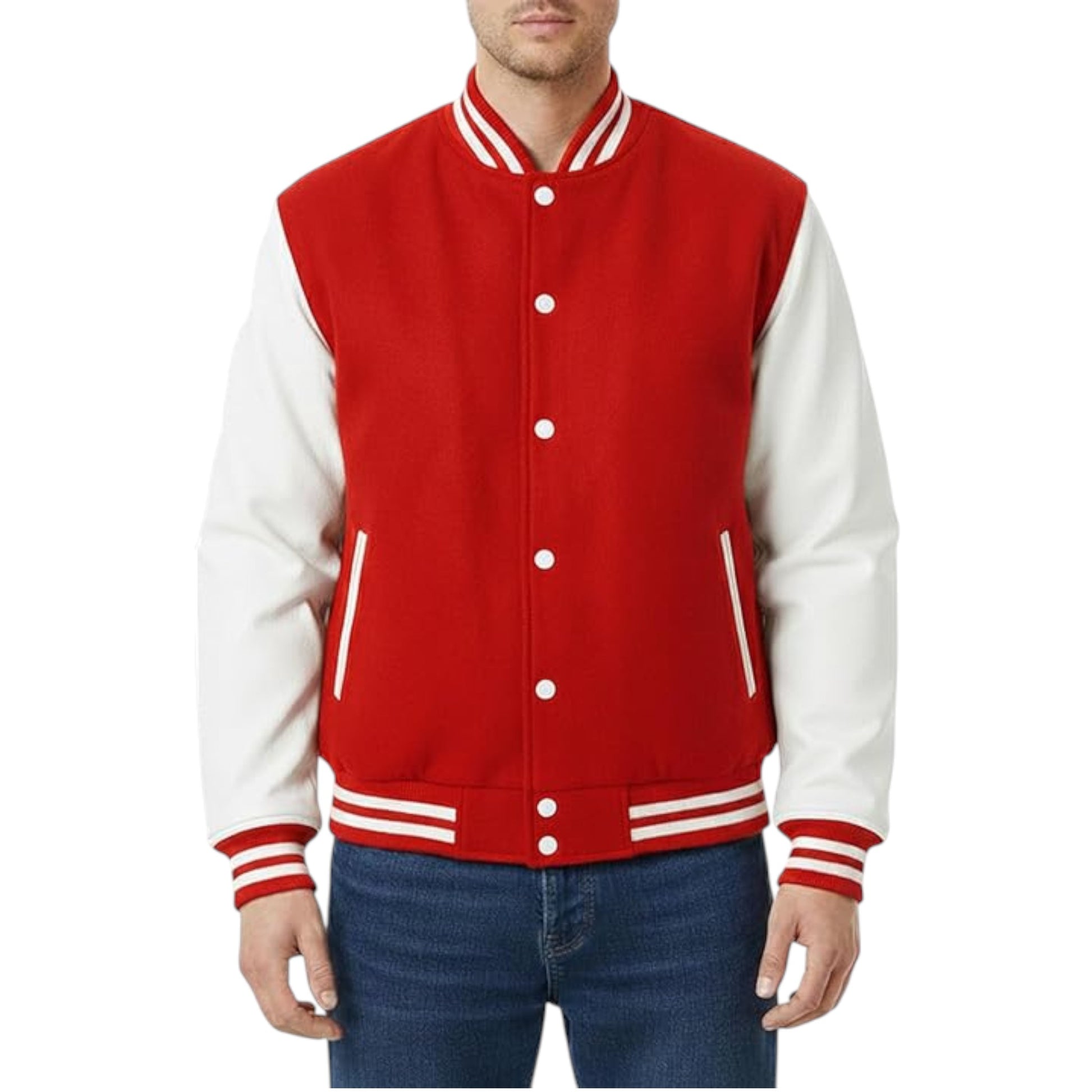 Make a bold statement with this unisex varsity jacket, designed for both men and women who love classic college style with a premium finish. Featuring a rich red body paired with genuine white leather sleeves, this jacket blends timeless letterman aesthetics with modern streetwear appeal. Perfect for casual wear, campus life, and everyday layering, it delivers comfort, durability, and standout style.
